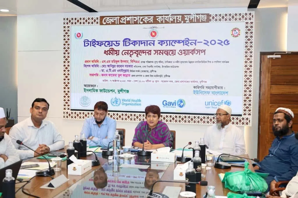 মোঃ শফিকুল ইসলাম ভূঞা (মুন্সীগঞ্জ): মুন্সীগঞ্জে ধর্মীয় নেতৃবৃন্দের অংশগ্রহণে টাইফয়েড টীকাদান ক্যাম্পেইন-২০২৫ সংক্রান্ত এক ওয়ার্কশপ সোমবার (৭ অক্টোবর) মুন্সীগঞ্জ জেলা প্রশাসকের সম্মেলন কক্ষে অনুষ্ঠিত হয়েছে। ইসলামিক ফাউন্ডেশন বাংলাদেশ, মুন্সীগঞ্জের আয়োজনে এবং ইউনিসেফ বাংলাদেশের কারিগরি সহায়তায় এ কর্মশালার আয়োজন করা হয়।