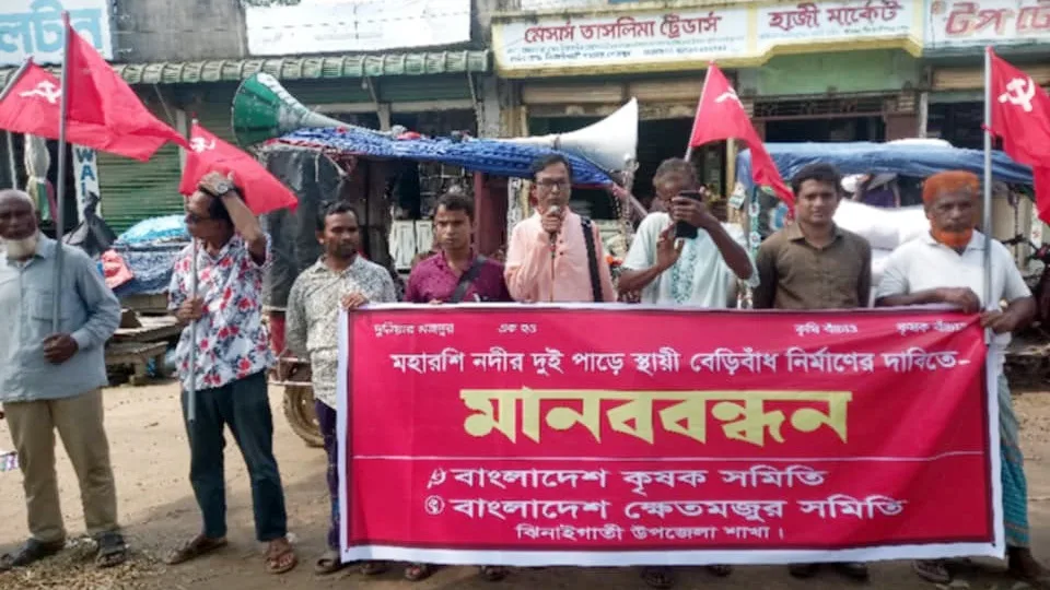 হারুন অর রশিদ দুদু, শেরপুর : শেরপুরের ঝিনাইগাতীতে মহারশি নদীর দুই পাড়ে স্থায়ী বেড়িবাঁধ নির্মাণের দাবিতে মানববন্ধন করেছে বাংলাদেশ কৃষক সমিতি ও বাংলাদেশ ক্ষেতমজুর সমিতি ঝিনাইগাতী উপজেলা শাখা। ৭ অক্টোবর মঙ্গলবার বেলা ১১টায় উপজেলা সদর বাজারের প্রধান সড়কে ঘণ্টাব্যাপী এ মানববন্ধন অনুষ্ঠিত হয়।