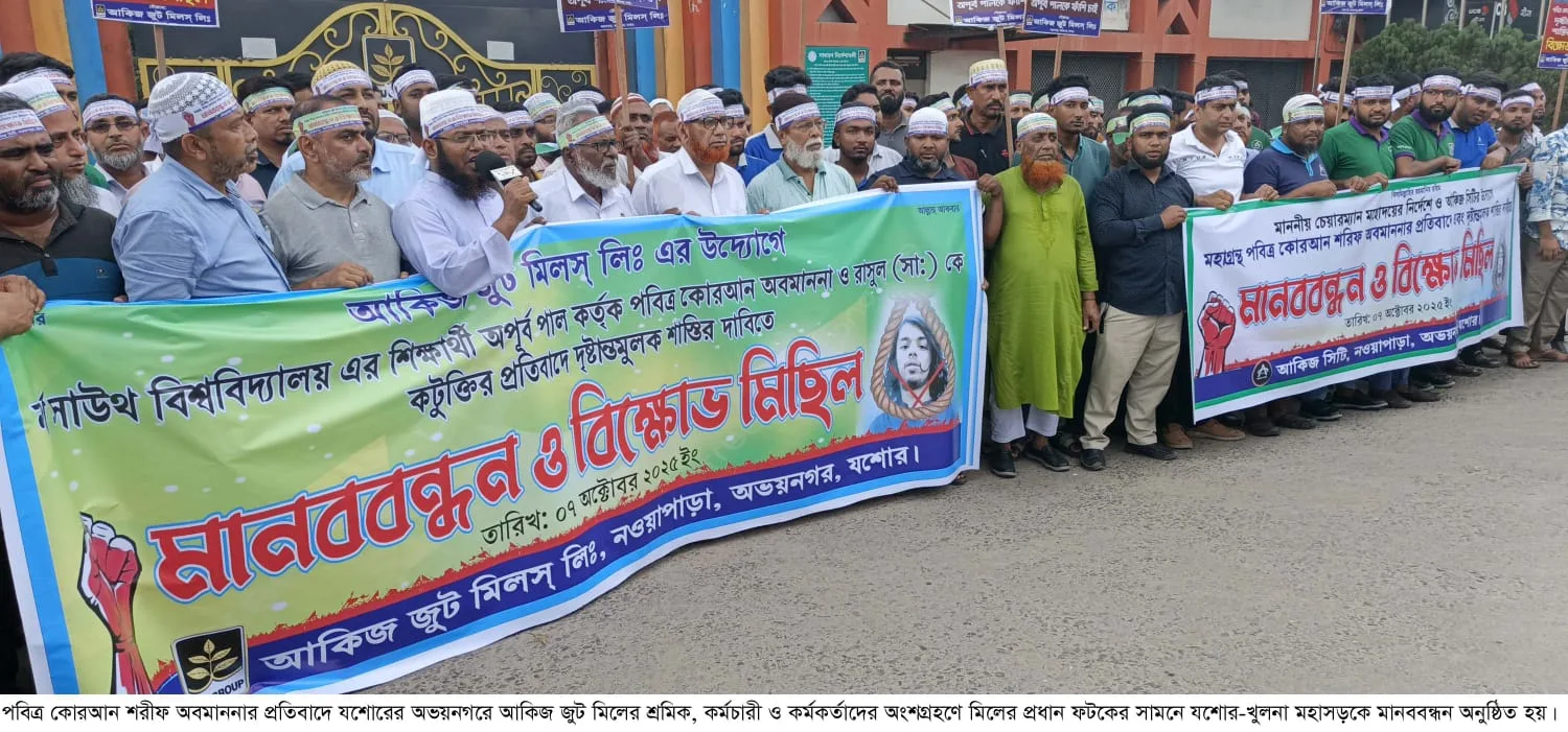 মতিন গাজী, যশোর: পবিত্র কোরআন শরীফ অবমাননার প্রতিবাদে যশোরের অভয়নগরে আকিজ জুট মিলস্ লিমিটেডের শ্রমিক, কর্মচারী, কর্মকর্তারা মানববন্ধন ও বিক্ষোভ মিছিল করেছে। মঙ্গলবার (৭ অক্টোবর) সকালে উপজেলার তালতলা এলাকায় আকিজ জুট মিলের সামনে যশোর-খুলনা মহাসড়কে এ মানববন্ধন ও বিক্ষোভ মিছিল অনুষ্ঠিত হয়।