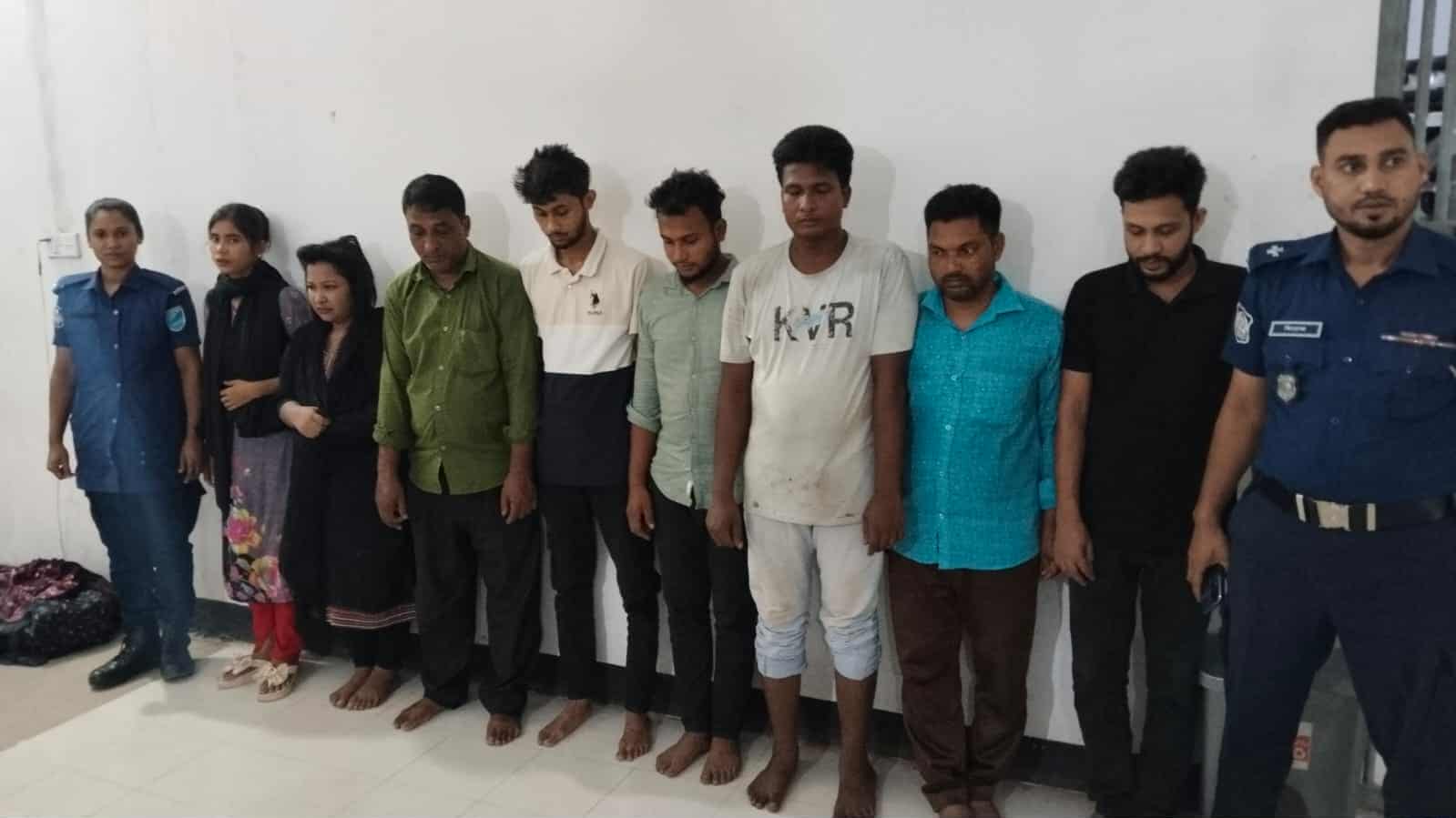 গ্রেপ্তারকৃতরা হলো- সিলেট জেলার ফেঞ্জুগঞ্জ থানার গিলাছলা গ্রামের মোঃ হোসেনের ছেলে মোঃ আক্কাছ মিয়া ওরফে আলম (৪৮), পটুয়াখালী জেলার মির্জাগঞ্জ থানার তারাবুনিয়া গ্রামের খলিলুর রহমানের ছেলে মেহেদী হাসান অভি (২৫), গাজীফুর জেলার সদর থানার সরকারপাড়া গ্রামের মীর সাইদুর লিটনের ছেলে মোঃ নাজমুল হাসান জিসান (২৪), মানিকগঞ্জ জেলার ঘিওর থানার কাশাত বাংলাবাজার গ্রামের জিন্নাত বেপারীর ছেলে মোঃ আবুল হোসেন (৪১), ঢাকা জেলার ধামরাই থানার গাওয়াইল গ্রামের মোঃ হামিদের ছেলে মোঃ সুমন (২৫), একই গ্রামের নুর হোসেনের ছেলে মোঃ জুলহাস (৩০), পঞ্চগড় জেলার আটোয়ারী থানার গুচ্ছগ্রাম এলাকার রাজু ইসলামের মেয়ে রাজমনি (১৯) এবং দিনাজপুর জেলার বজাগঞ্জ থানার সেতাবগঞ্জ গ্রামের শফিকের মেয়ে সুমি আক্তার (২২)।