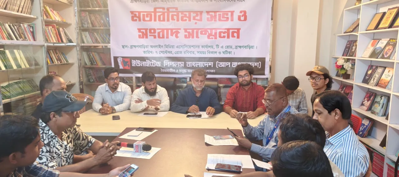 দেলোয়ার হোসাইন মাহদী, ব্রাহ্মণবাড়িয়া: ব্রাহ্মণবাড়িয়ায় “জুলাই গণঅভ্যুত্থান ও আগামীর বাংলাদেশ” শীর্ষক মতবিনিময় সভা ও সংবাদ সম্মেলন অনুষ্ঠিত হয়েছে। রবিবার (৭ সেপ্টেম্বর) বিকেল ৩টায় শহরের অনলাইন মিডিয়া অ্যাসোসিয়েশনের কার্যালয়ে আনুষ্ঠানিকভাবে আত্মপ্রকাশ করে জুলাই অভ্যুত্থানের অন্যতম সংগঠক প্ল্যাটফর্ম ইউনাইটেড পিপলস বাংলাদেশ (আপ বাংলাদেশ)-এর ব্রাহ্মণবাড়িয়া জেলা আহ্বায়ক কমিটি।