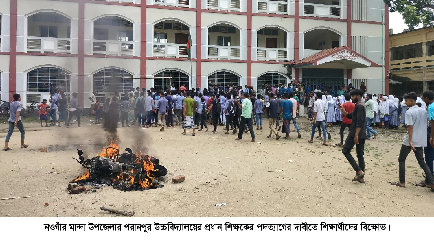 এ সময় বিদ্যালয় চত্বরে থাকা প্রধান শিক্ষক আব্দুল ওয়াহেদের মোটরসাইকেলটি শিক্ষার্থীরা আগুন দিয়ে পুড়িয়ে দেয়। সংবাদ পেয়ে মান্দা থানা পুলিশ ঘটনাস্থলে পৌঁছে স্থানীয় লোকজনের সহায়তায় শিক্ষার্থীদের শান্ত করার চেষ্টা করে ব্যর্থ হন। পরে বিকেল ৩টার দিকে শিক্ষার্থীদের দাবীর মুখে পদত্যাগ করেন প্রধান শিক্ষক আব্দুল ওয়াহেদ।