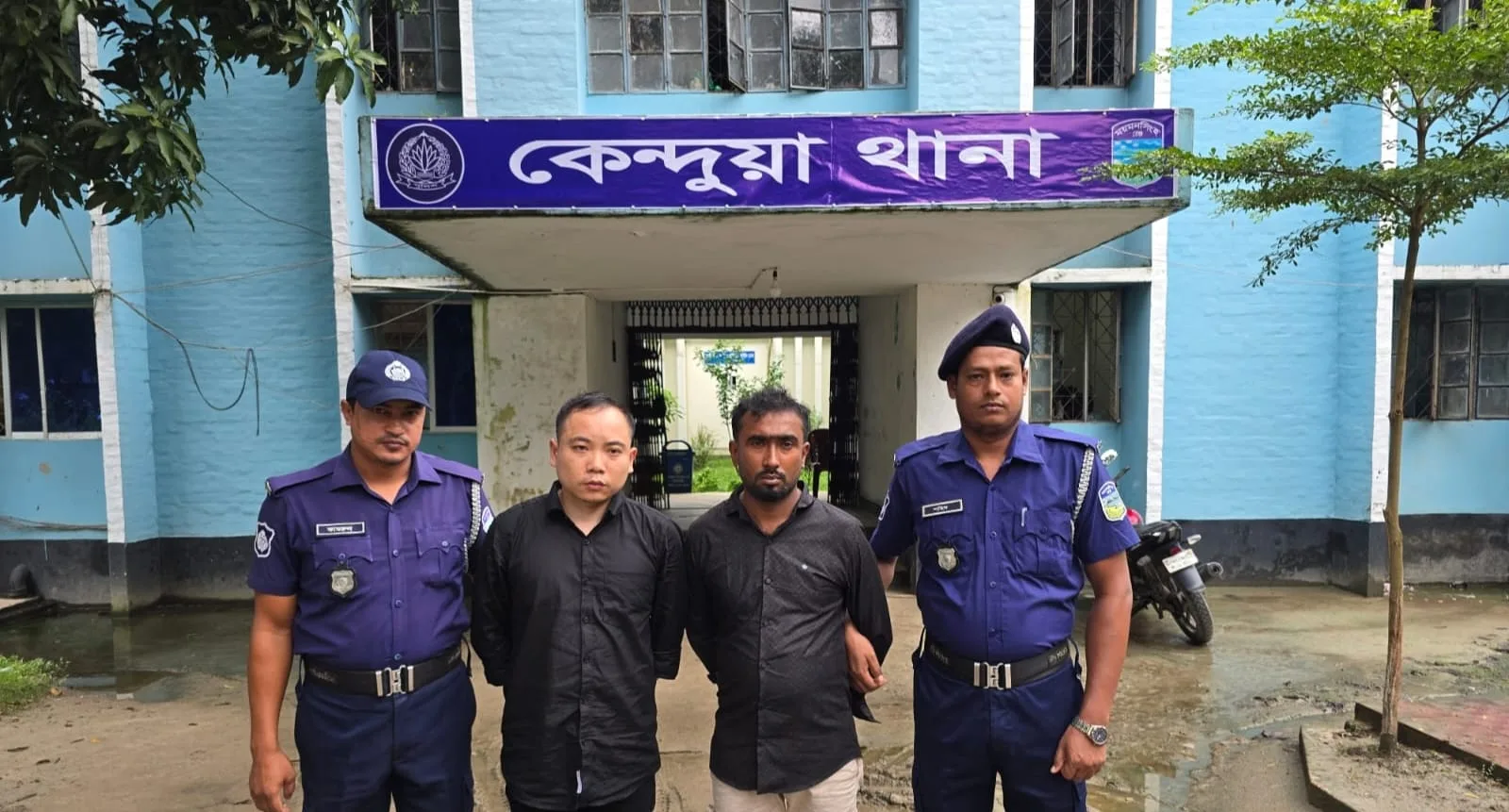 সোমবার (১৫ সেপ্টেম্বর) দুপুরে অতিরিক্ত পুলিশ সুপার (ডিএসবি) হাফিজুল ইসলাম এ তথ্য নিশ্চিত করেন। এর আগে রোববার (১৪ সেপ্টেম্বর) রাতে কেন্দুয়া পৌরশহরের কমলপুর এলাকায় তাদের আটক করা হয়।গ্রেপ্তারকৃতরা হলেন চীনা নাগরিক লি ওই হাও ও বাংলাদেশি নাগরিক কুড়িগ্রামের মোঃ ফরিদুল ইসলাম।
