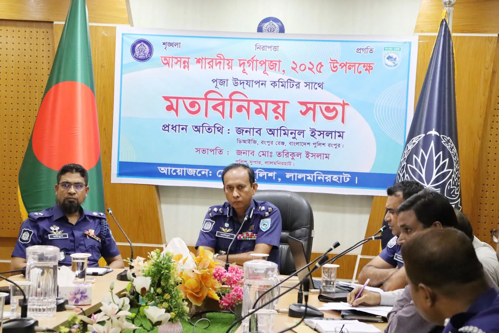আমিনুল ইসলাম, ডিআইজি, রংপুর রেঞ্জ, বাংলাদেশ পুলিশ, রংপুর মহোদয়।অনুষ্ঠানের শুরুতে আসন্ন দুর্গাপূজা উদযাপন লালমনিরহাট জেলায় নির্বিঘ্নে নিছিদ্র নিরাপত্তা ব্যবস্থার মধ্যে দিয়ে সম্পন্ন করতে জেলা পুলিশ কর্তৃক গৃহীত নিরাপত্তা পরিকল্পনা ও আইনশৃঙ্খলা পরিস্থিতির নিয়ে উপস্থিত পূজা উদযাপন কমিটির নেতৃবৃন্দের সকলকে অবহিত করেন।