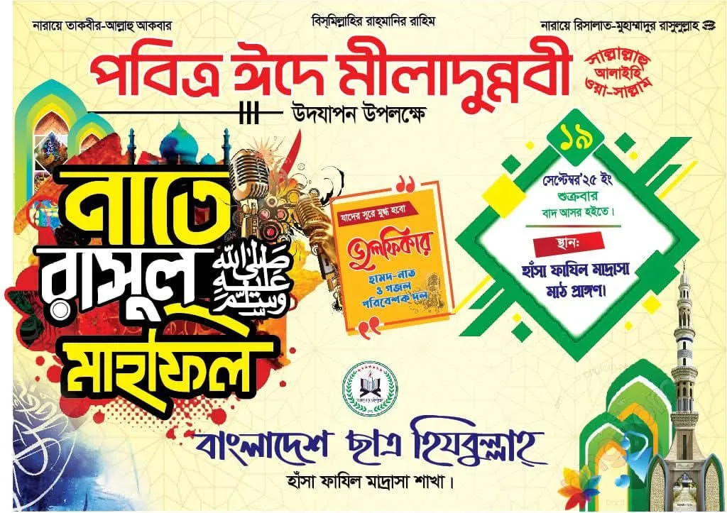 ভোরের দূত প্রতিবেদক:পবিত্র ঈদে মিলাদুন্নবী (সা.) উদযাপন উপলক্ষে চাঁদপুরের ফরিদগঞ্জ উপজেলার হাসা ফাজিল মাদ্রাসা মাঠে গতকাল শুক্রবার (১৯ সেপ্টেম্বর ২০২৫) বাদ আসর থেকে শুরু হয় নাতে রাসূল (সা.) মাহফিল। এ আয়োজন করে বাংলাদেশ ছাত্র হিযবুল্লাহ, হাসা ফাজিল মাদ্রাসা শাখা।
