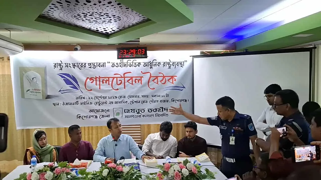কিশোরগঞ্জ প্রতিনিধি: অনুমতি না থাকায় কিশোরগঞ্জে হেযবুত তওহীদ আয়োজিত একটি গোলটেবিল বৈঠক পুলিশ বন্ধ করে দিয়েছে। ‘রাষ্ট্র সংস্কারের প্রস্তাবনা – তওহীদভিত্তিক আধুনিক রাষ্ট্র ব্যবস্থা’ শিরোনামে জেলা শাখার এই অনুষ্ঠানটি সোমবার (২২ সেপ্টেম্বর) বেলা ১১টায় শহরের একটি রেস্তোরাঁর পার্টি সেন্টারে শুরু হওয়ার কথা ছিল।