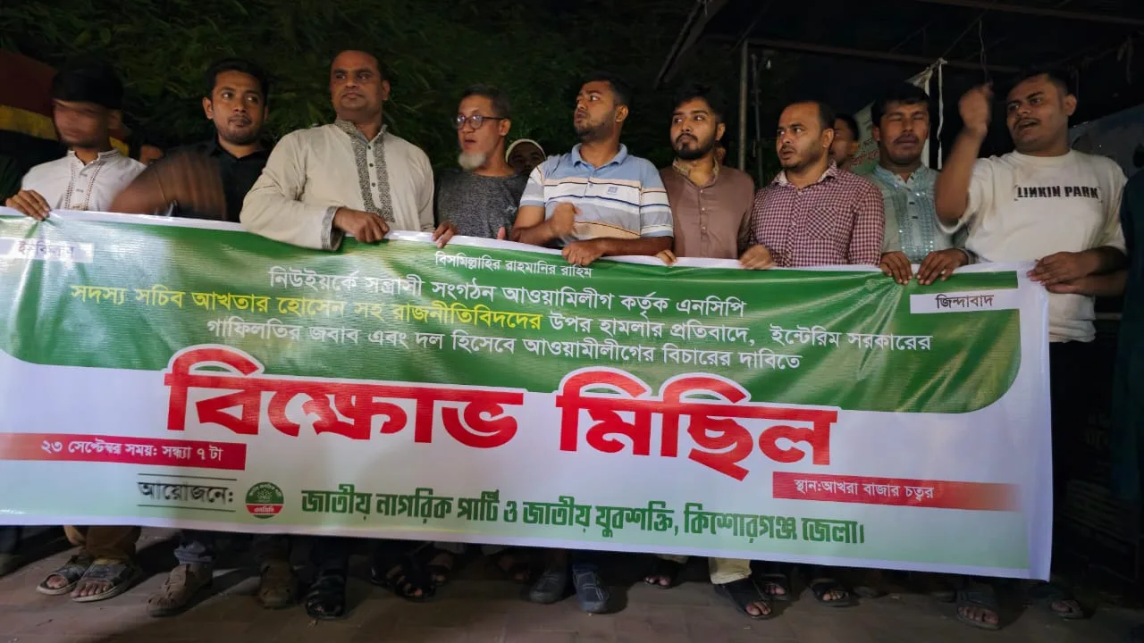 মশিউর রহমান নাদিম, কিশোরগঞ্জ: নিউইয়র্কে জাতীয় নাগরিক পার্টির (এনসিপি) সদস্য সচিব আক্তার হোসেনের উপর হামলার প্রতিবাদে কিশোরগঞ্জে বিক্ষোভ মিছিল ও সমাবেশ করেছে জেলা জাতীয় নাগরিক পার্টি ও এর অঙ্গ সংগঠন জাতীয় যুব শক্তি।