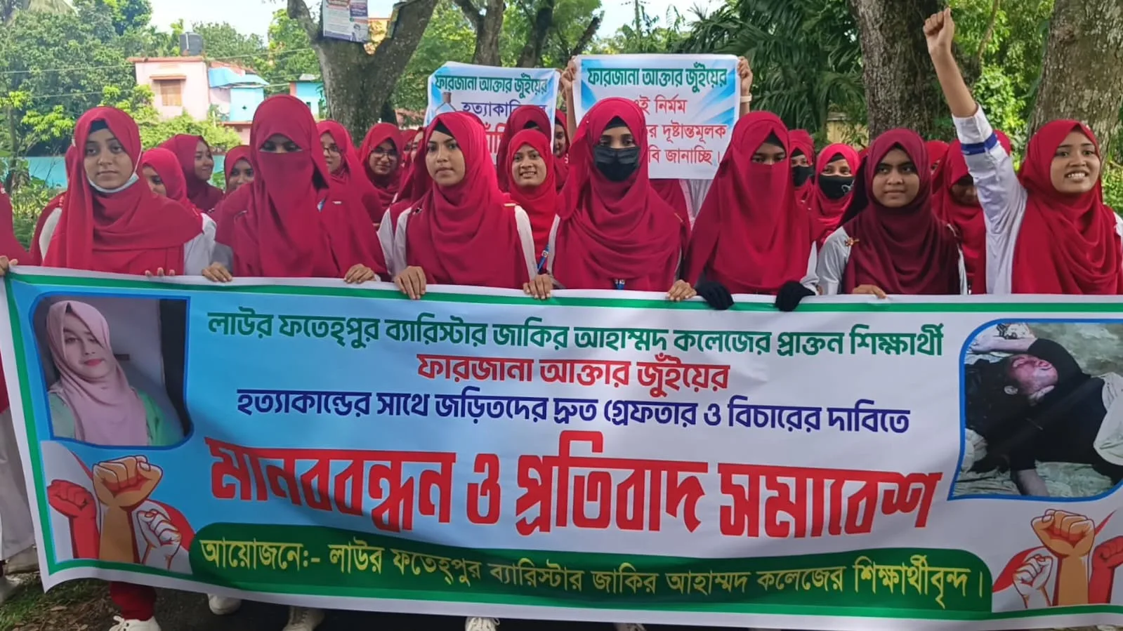 ব্রাহ্মণবাড়িয়ার নবীনগর উপজেলার লাউর ফতেহপুরে কলেজছাত্রী ফারজানা আক্তার জুঁই হত্যার প্রতিবাদে মানববন্ধন ও প্রতিবাদ সমাবেশ অনুষ্ঠিত হয়েছে। শিক্ষার্থীরা এ সময় জুঁই হত্যায় জড়িতদের দ্রুত গ্রেফতার ও দৃষ্টান্তমূলক শাস্তির দাবি জানান।