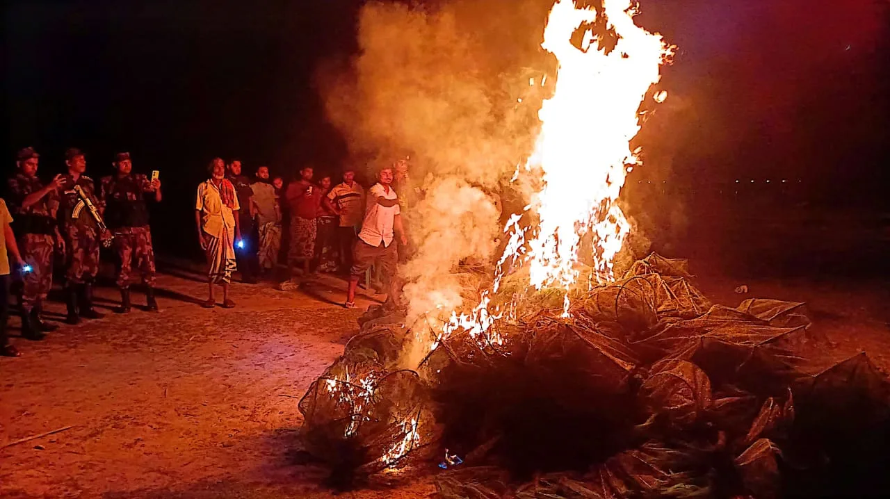 নাইম উদ্দীন, নওগাঁ: নওগাঁর পোরশায় টাস্কফোর্স অভিযান চালিয়ে পুনর্ভবা নদী থেকে মাছ ধরার কাজে ব্যবহৃত অবৈধ রিং জাল আটক করে পুড়িয়ে বিনষ্ট করা হয়েছে।
