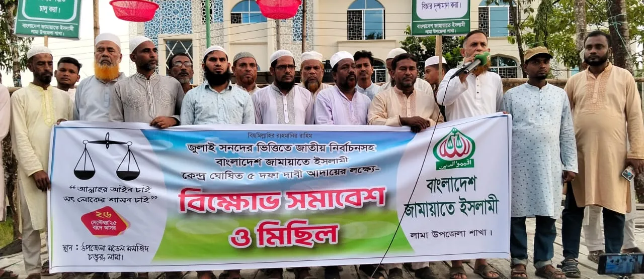 আমিনুল ইসলাম খন্দকার, বান্দরবান: বান্দরবানের লামা উপজেলায় জুলাই সনদ ঘোষণা ও আনুপাতিক প্রতিনিধিত্বের (পিআর) নির্বাচনসহ ৫ দফা দাবিতে বিক্ষোভ মিছিল ও সমাবেশ করেছে বাংলাদেশ জামায়াতে ইসলামী।
