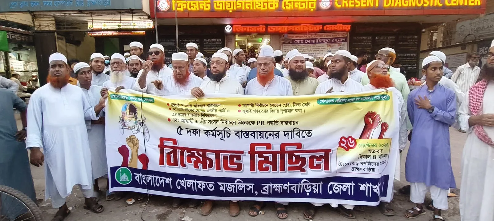 জুলাই সনদ বাস্তবায়ন ও PR পদ্ধতির দাবিতে ব্রাহ্মণবাড়িয়ায় খেলাফত মজলিসের বিক্ষোভ