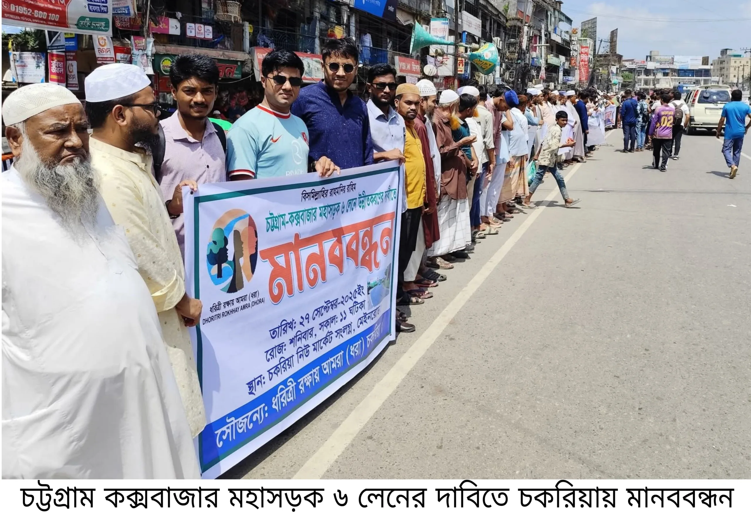 মানববন্ধনে বক্তারা বলেন, “চট্টগ্রাম-কক্সবাজার মহাসড়ক দ্রুত ছয় লেন না করা হলে কঠোর কর্মসূচির ঘোষণা দেওয়া হবে।”