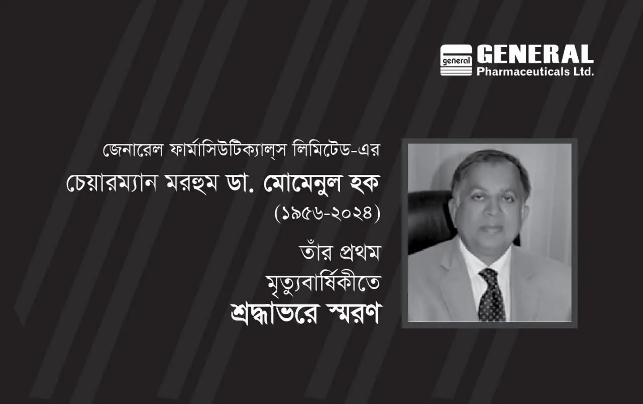জেনারেল ফার্মাসিউটিক্যালস পরিবার: গত বছরের এই দিনে আমাদের মধ্যে আর ছিলেন না প্রজ্ঞাবান ও দূরদর্শী নেতা, প্রয়াত ডা. মোমেনুল হক। আজ, ২৮ সেপ্টেম্বর ২০২৫ খ্রিঃ, তাঁর প্রথম মৃত্যুবার্ষিকীতে আমরা গভীর শ্রদ্ধা ও ভালোবাসার সঙ্গে স্মরণ করছি তাঁর অসামান্য অবদান, মানবিক দৃষ্টিভঙ্গি এবং নৈতিক নেতৃত্বকে।