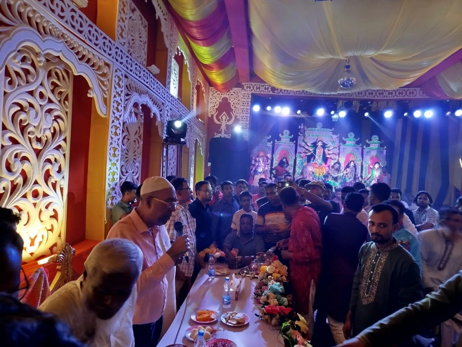 “দুর্গাপূজা শুধু একটি ধর্মীয় অনুষ্ঠান নয়, এটি বাঙালির চিরায়ত সংস্কৃতির অংশ। পূজা মন্ডপ আমাদের সৌন্দর্য, শৈল্পিকতা ও ভ্রাতৃত্ববোধের প্রতিচ্ছবি। এখানে এসে আমি অনুপ্রাণিত হয়েছি। আমি বিশ্বাস করি, সাম্প্রদায়িক সম্প্রীতি ও শান্তিপূর্ণ সহাবস্থানই আমাদের শক্তি। সবাইকে শুভেচ্ছা ও অভিনন্দন।”এই সময়ে প্রধান অতিথি সকল পূজা মন্ডপের কমিটিদের হাতে কিছু আর্থিক উপহার তুলে দেন, যাতে তারা আনন্দে পূজা উদযাপন করতে পারে।