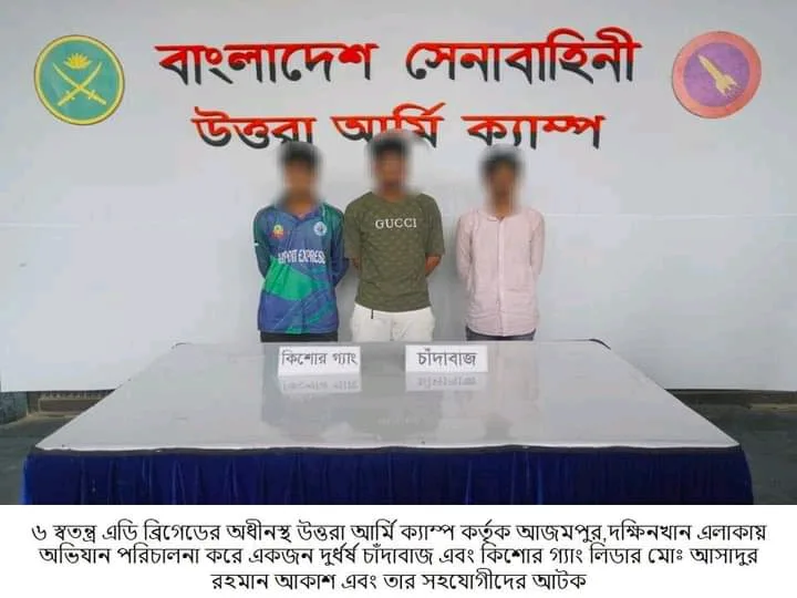 ভোরের দূত ডেস্ক: ঢাকা, ০৪ অক্টোবর ২০২৫ (শনিবার): আজ ভোর রাতে সুনির্দিষ্ট গোয়েন্দা তথ্যের ভিত্তিতে বাংলাদেশ সেনাবাহিনীর নেতৃত্বে একটি যৌথ অভিযানে সমন্বয়ক পরিচয়ে সন্ত্রাসী কার্যক্রমে লিপ্ত চাঁদাবাজ ও কিশোর গ্যাং লিডার আসাদুর রহমান আকাশ, তার সহযোগী মোঃ ফরিদ উদ্দিন ও মোঃ রবিনকে উত্তরার দক্ষিনখান এলাকা থেকে গ্রেফতার করা হয়।